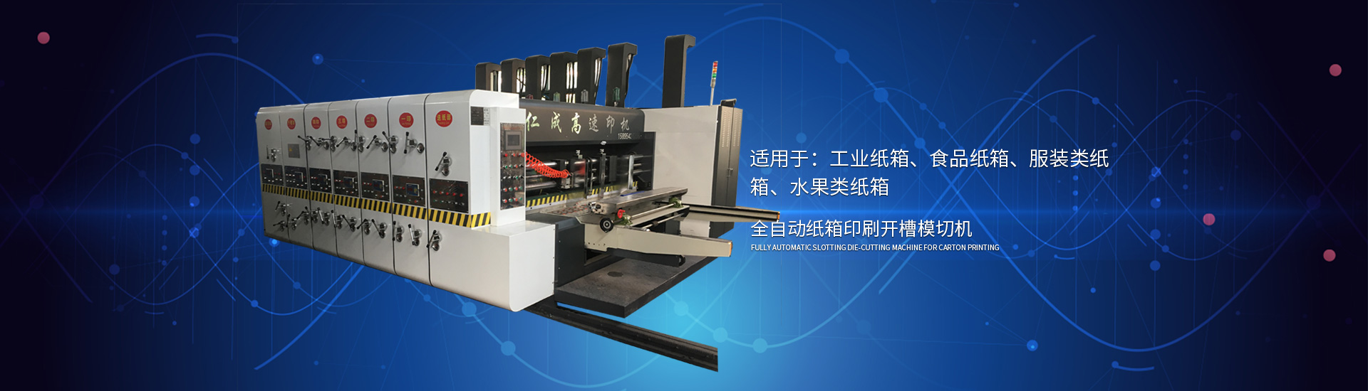 主要產(chǎn)品有高速印刷開槽模切機(jī)、半自動水墨印刷開槽模切機(jī)、全自動粘箱打包聯(lián)動線、全自動 插格機(jī)、半自動粘箱機(jī)、半自動釘箱機(jī)、手動釘箱機(jī)、薄刀分紙機(jī)、PE繩打包機(jī)、PP帶智能打包 機(jī)、圓壓圓模切機(jī)、平壓壓痕機(jī)、自動裱紙機(jī)、水墨污水處理機(jī)等產(chǎn)品